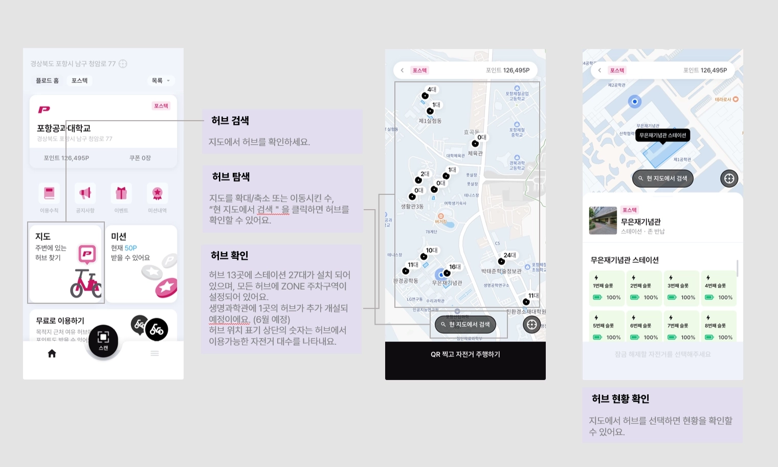 허브는 포링이 대여와 반납이 가능한 장소입니다. 무선충전스테이션이 설치되어있어 반납과 동시에 충전이 시작되며 안전하고 질서있게 주차가 가능합니다.
